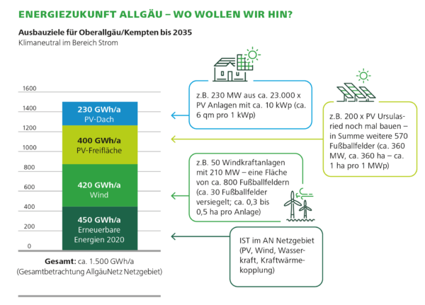Der Ausbau der Erneuerbaren Energien ist zu einem großen Teil von der Nutzung der Potenziale im Bereich Photovoltaik und Windenergie abhängig. Die PV-Ausbauziele für ein klimaneutrales Oberallgäu/Kempten belaufen sich bis 2035 im Bereich Strom bei stetigem Zubau auf dann jährlich 230 Gigawattstunden durch PV-Dachanlagen (230 Megawatt Peak Anlagenleistung) sowie auf 400 Gigawattstunden pro Jahr durch PV in der Freifläche (400 Megawatt Peak Anlagenleistung). Wir werden zur Erreichung dieser Ziele des Landkreises Oberallgäu und der Stadt Kempten einen signifikanten Beitrag leisten.
